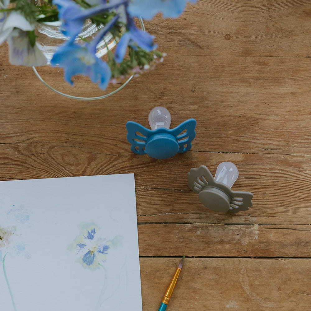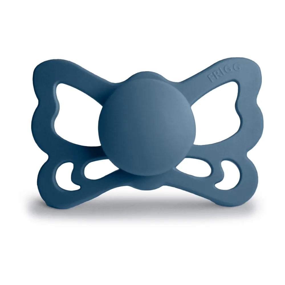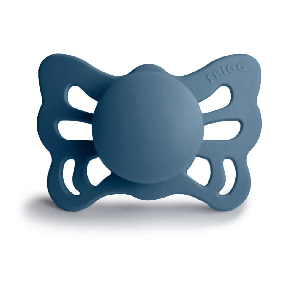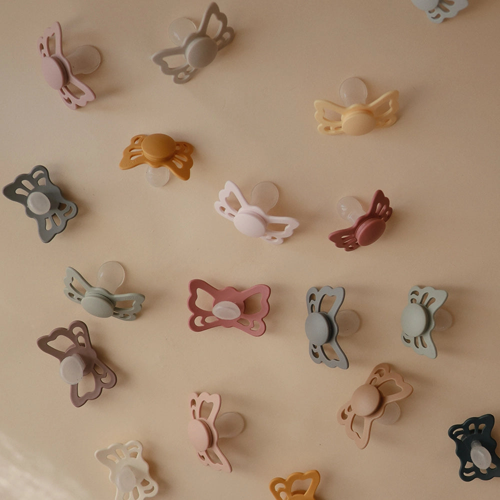 FRIGG Butterfly-sutten minder om formen på en sommerfugl. Skjoldet med bølgede kanter har store lufthuller og i midten finder du et rundt center, der fremhæver suttens elegance. Sutten er inspireret af den smukke sommerfugl – ikke kun af dens udseende, men også af dens magiske forvandling. For at blive en sommerfugl gennemgår en larve en transformationsproces. Under denne proces lever larven i en kokon og til sidst blomstrer den som en smuk sommerfugl.
