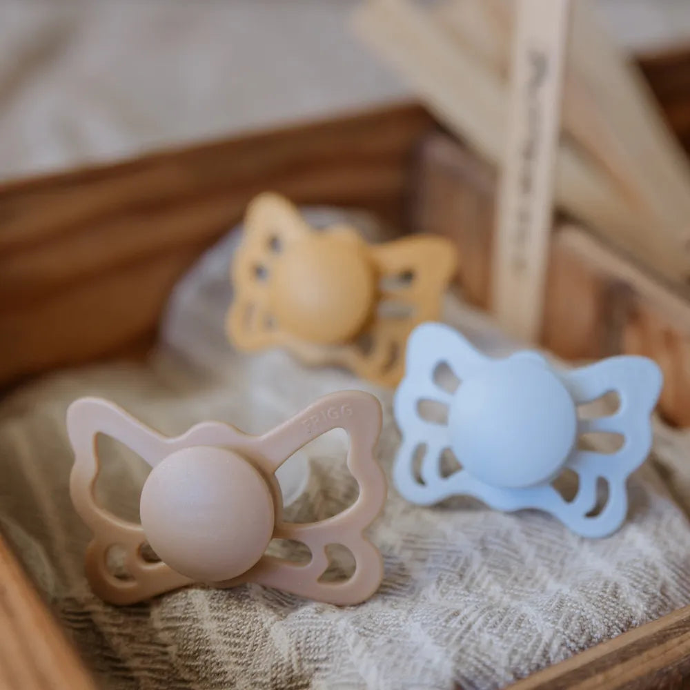 FRIGG Butterfly er en anatomisk sut med en suttedel, der matcher mundens form. Sutten er designet til at lægge mindre pres på ganen, gummerne og kæberne og det er den blideste type sut. Dette mindsker risikoen for skæve tænder og et skævt bid. Det ortodontiske design er perfekt til at understøtte den korrekte udvikling af babys tænder, kæbe og gane.