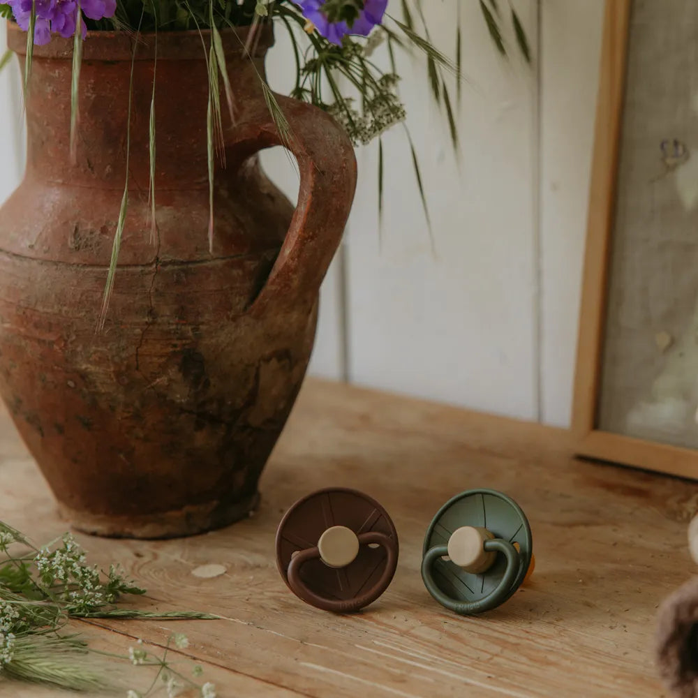 FRIGG har skabt kollektionen ’Little Viking’ som en hyldest til vikingerne samt nordisk mytologi, herunder den nordiske gudinde Frigg, som er inspirationen bag brandet. Sutteskjoldet, der er stærkt inspireret af vikingernes runde skjold, er dekoreret med Fehu-symbolet fra runealfabetet. Fehu er forbundet med frugtbarhed, overflod og åndelig rigdom.