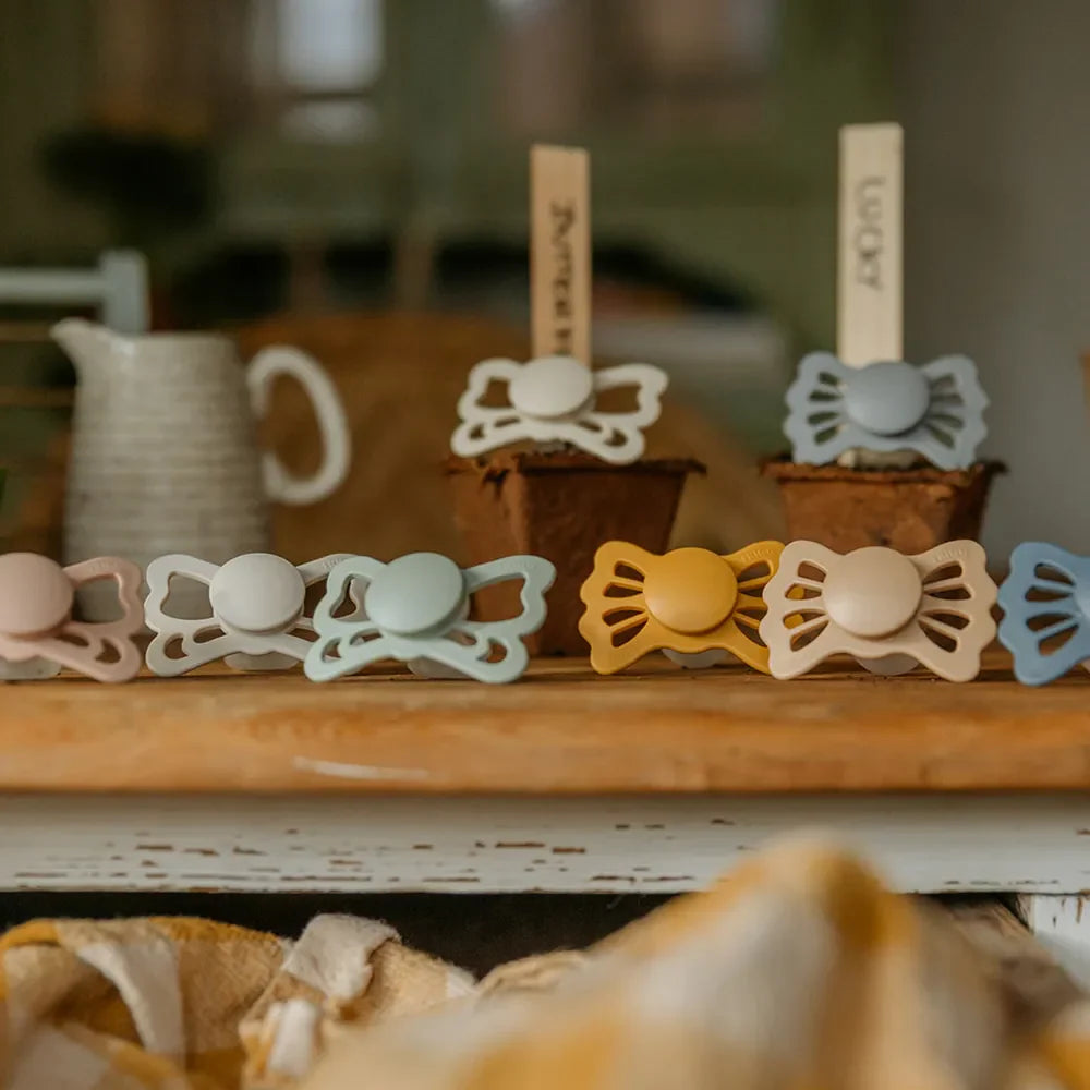 FRIGG Lucky er en sut inspireret af firkløveret. Skjoldet har bølgede kanter, der er formet som firkløverens blade, og disse blade reflekteres også på skjoldet og fungerer som lufthuller. I midten finder du et rundt center, der fremhæver suttens elegance.