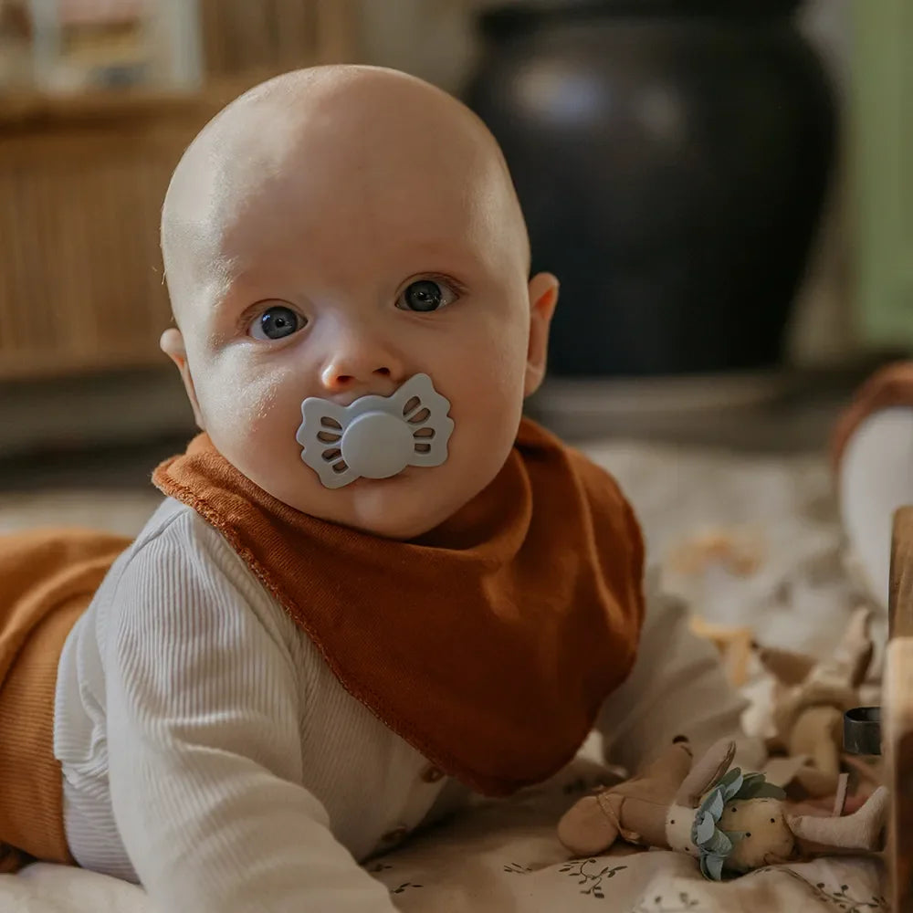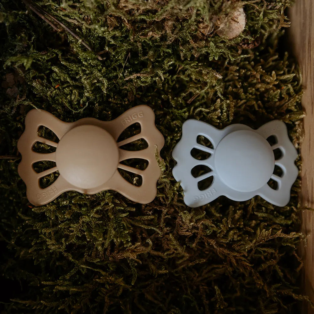 FRIGG Lucky er en sut inspireret af firkløveret. Skjoldet har bølgede kanter, der er formet som firkløverens blade, og disse blade reflekteres også på skjoldet og fungerer som lufthuller. I midten finder du et rundt center, der fremhæver suttens elegance.