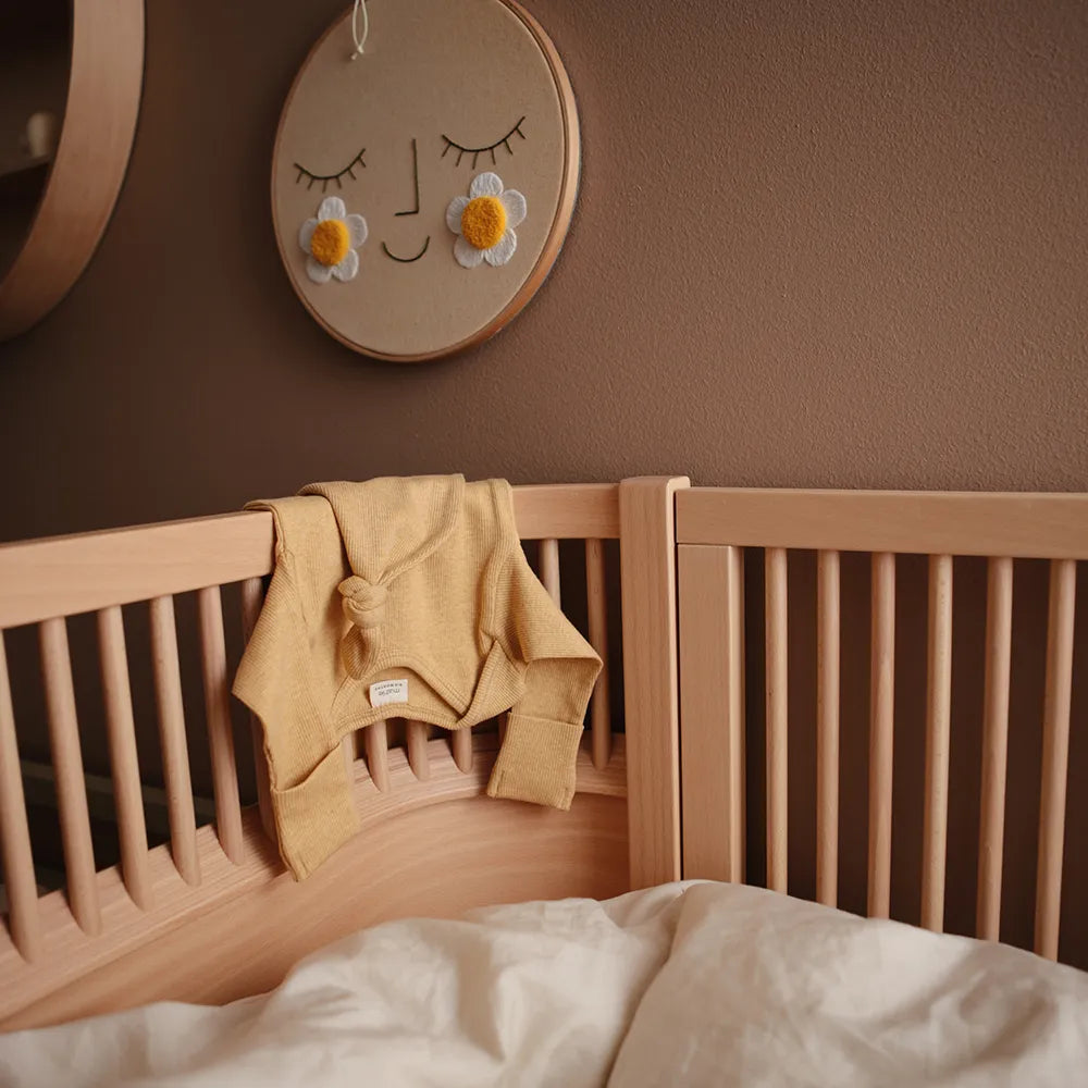 En lækker body i ribstrikket bomuld, som er dejlig at have på. Kvaliteten er blød og let, og designet er stilrent. Bindedetaljen gør denne body helt unik, og det er en detalje, som gør de hyppige bleskift nemmere for forældre.