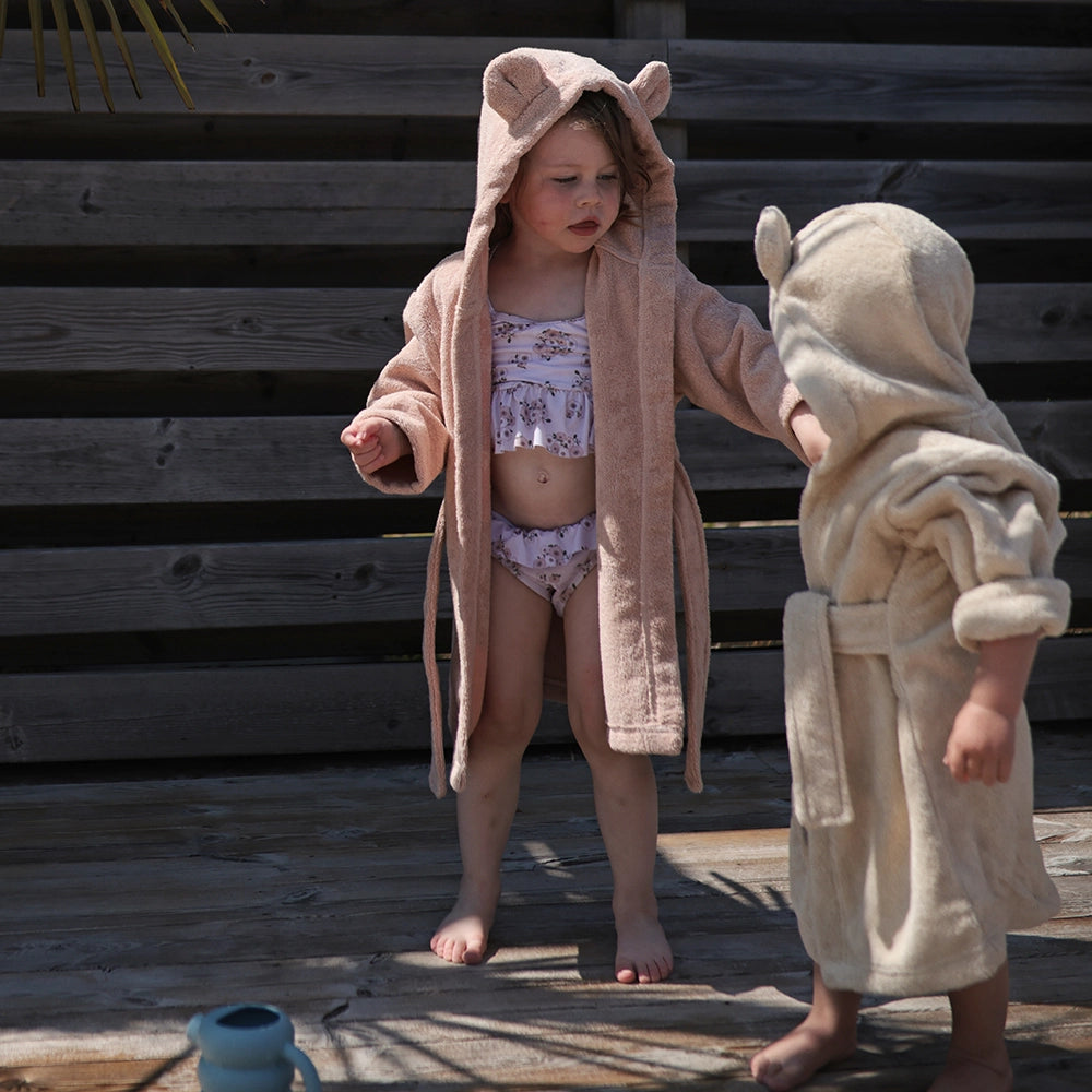 Designet er enkelt og skandinavisk med en hætte, der er formet med små bjørneører. Det giver et fint, legende udtryk uden at gå på kompromis med funktionaliteten. Mushie badekåbe passer godt ind i rutinerne omkring bad, putning og hyggestunder, hvor barnet kan blive pakket ind i noget, der både er praktisk og rart at være i.
