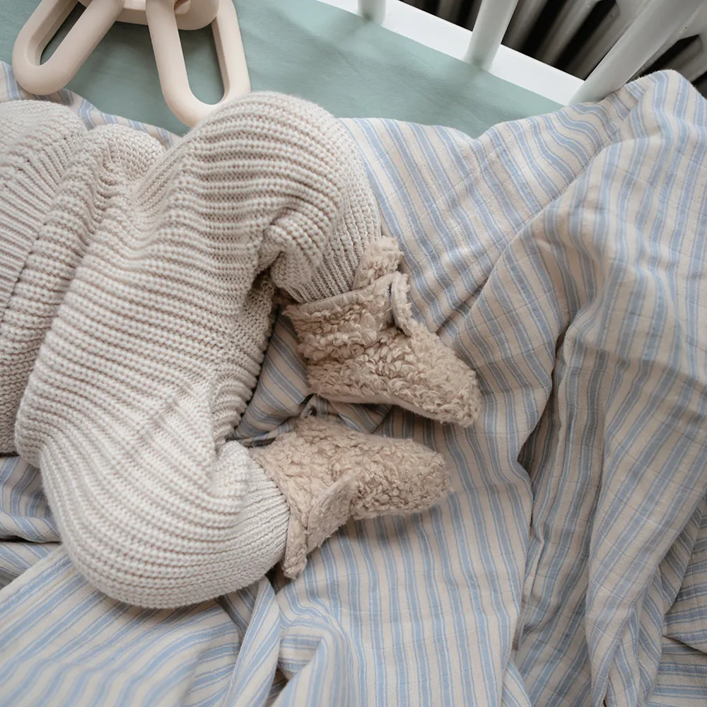 Bukserne er lavet af 100% økologisk bomuld og er skånsom mod børns følsomme hud. Sammensæt bukserne med Mushies striksweater og strikhue for et komplet look.