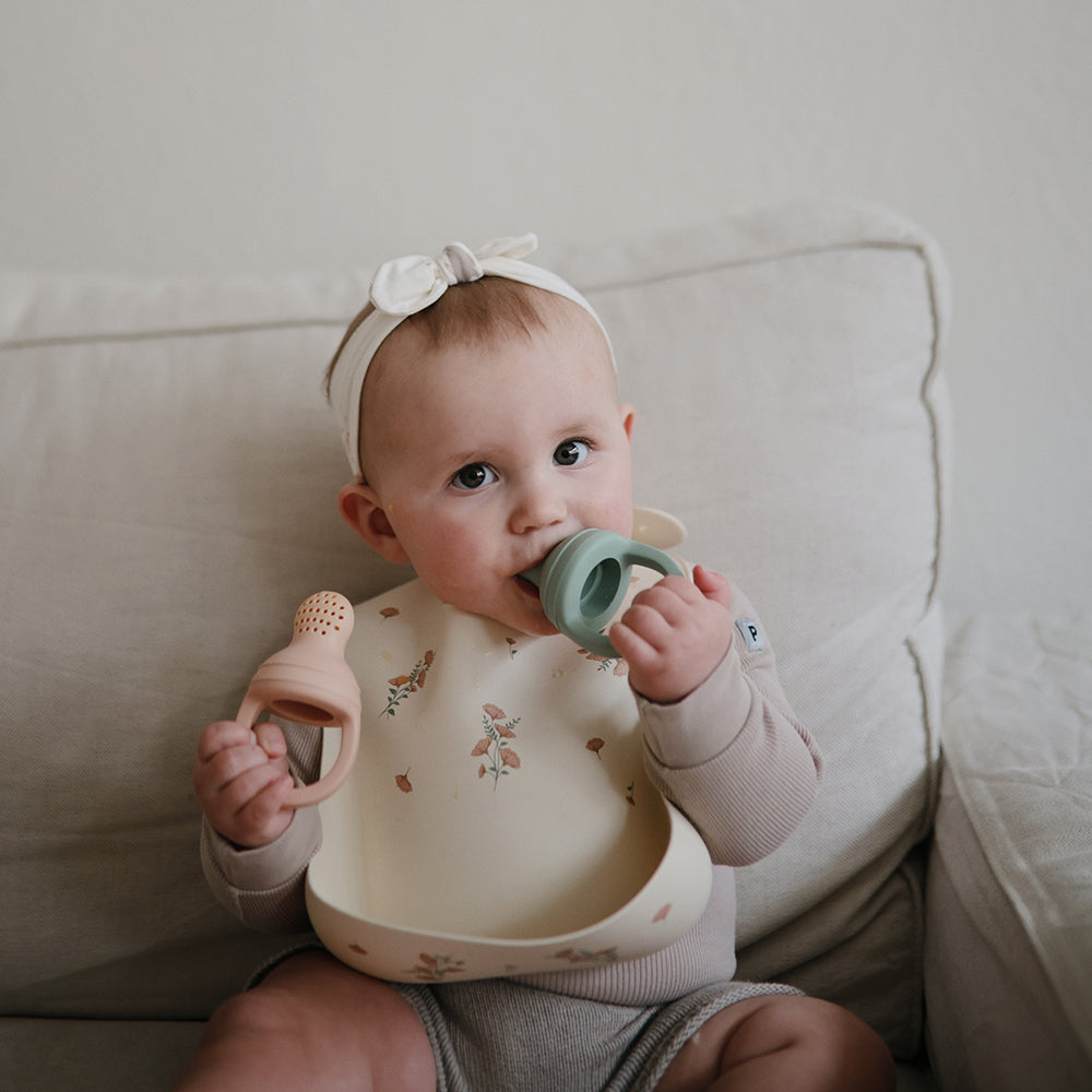 Dette sæt med frugtsutter og tilbehør samler støtter små børn på deres rejse mod selvstændig spisning.