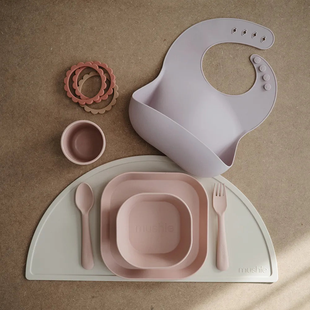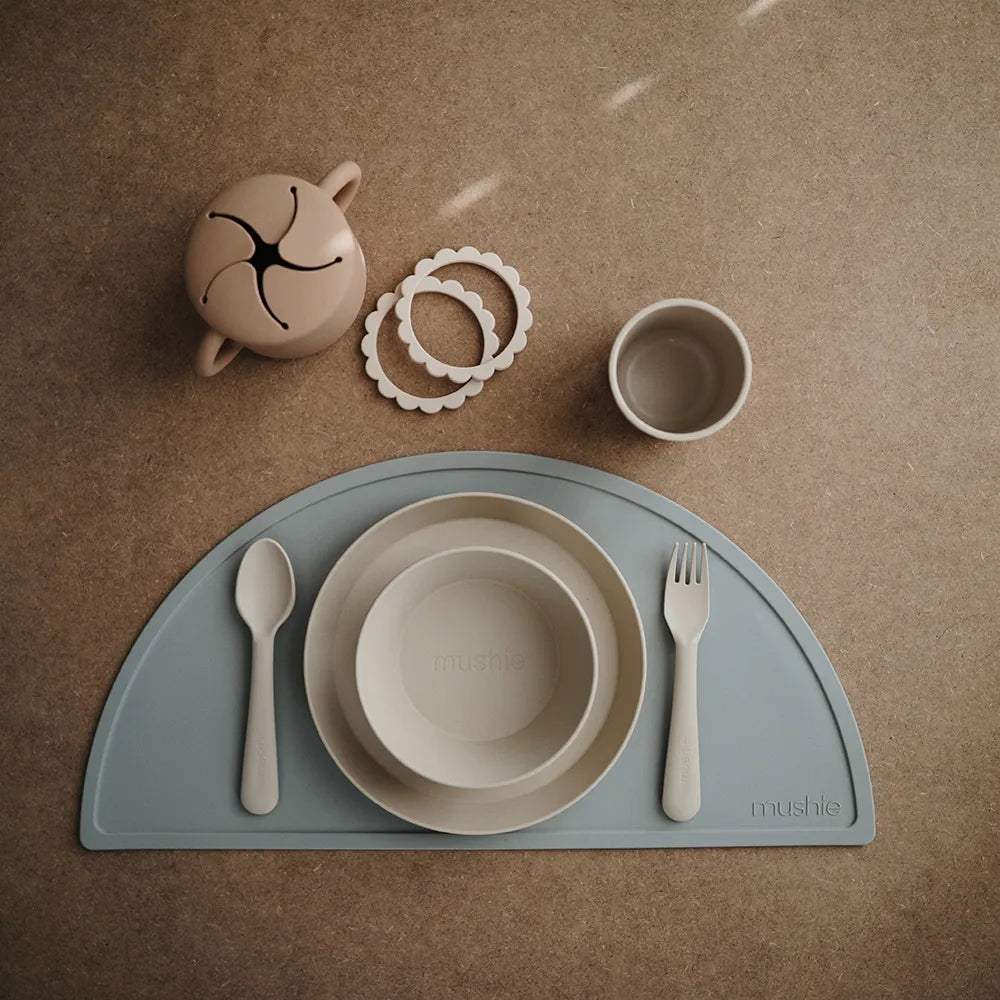 Bestiksættet er en del af Mushies danskproducerede service i enkelt og minimalistisk design, og farverne matcher skåle, kopper og tallerkener i samme serie.