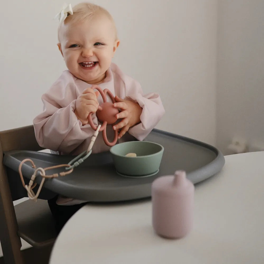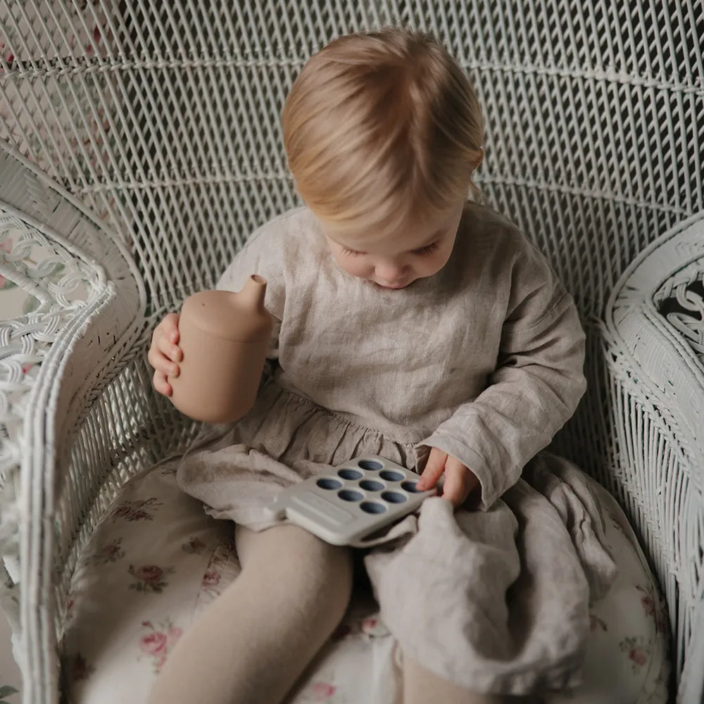Stilren kop til de mindste med et låg, der kan tages af. Den er fremstillet i fødevaregodkendt silikone og kan tåle at komme i opvaskemaskine og mikroovn. Med denne kop skal du ikke tænke på spild, og derudover stimulerer den sanserne og udvikler dit barns finmotorik. Koppen er perfekt til overgangen fra sutteflaske til drikkekop.