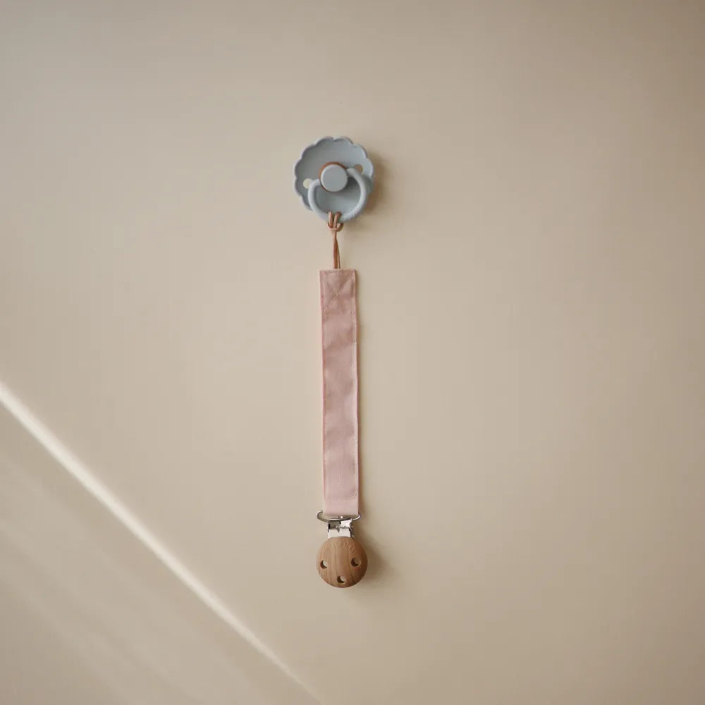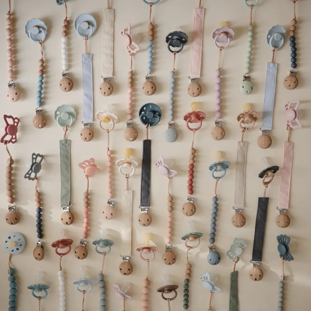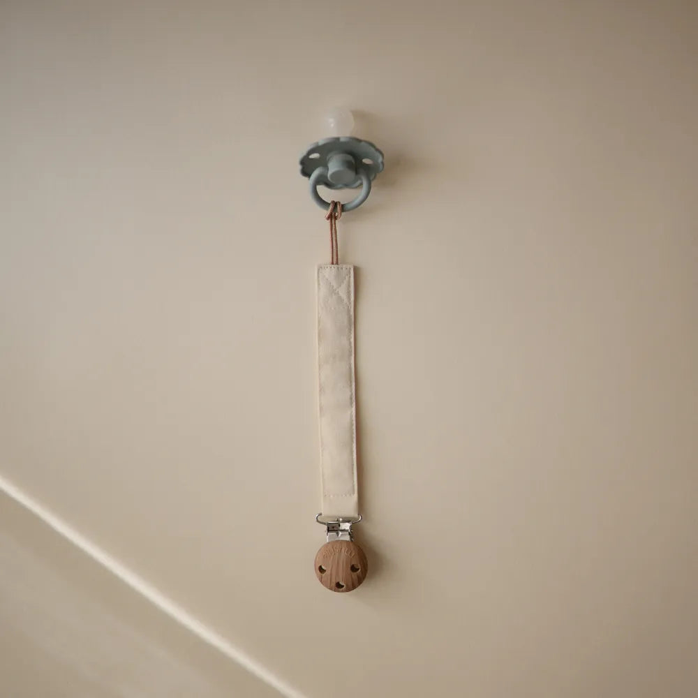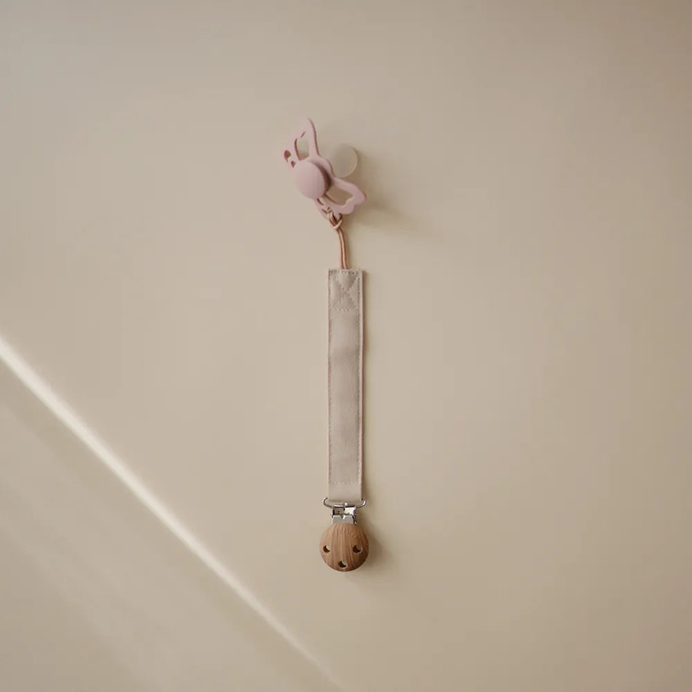 Suttesnoren har en vandafvisende indvendig belægning for ekstra holdbarhed. Det bløde stof sikrer komfort, mens silikoneklipsen i træ-lignende look holder sutten sikkert fast på tøjet og sørger for, at den ikke ender på gulvet.